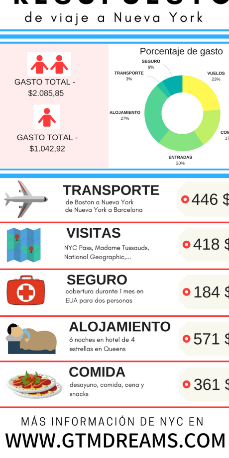 Sumergirse en la gran manzana durante una semana puede ser una experiencia increíble, pero hay que tener bien atado el presupuesto para no quedarse sin blanca a mitad del viaje. Aquí te dejo una idea de lo que podrías gastar: